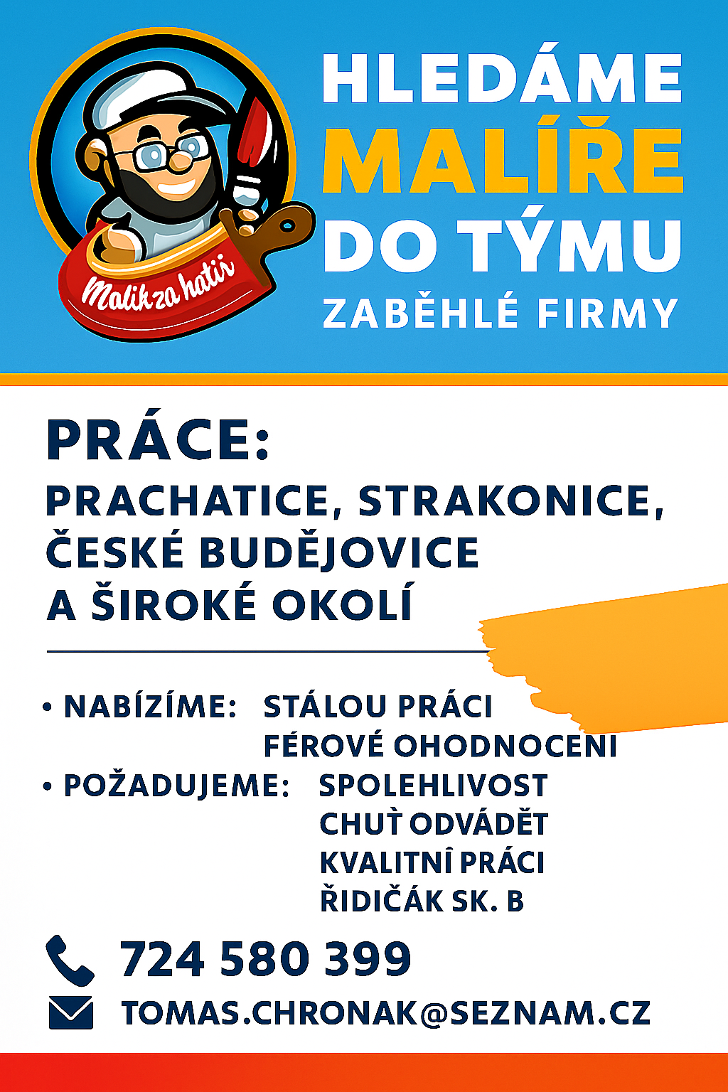 Hledáme šikovného malíře do našich řad. Jezdíme po jižních Čechách, jsme každý den doma. Potřeba je spolehlivost, šikovné ruce, chuť do práce a řidičský průkaz skupiny B. Domluva jistá, v případě zájmu se ozvěte. Jsme z Jižních Čech od Prachatic. Chtěli byste u nás pracovat? Kontaktujte nás ještě dnes!